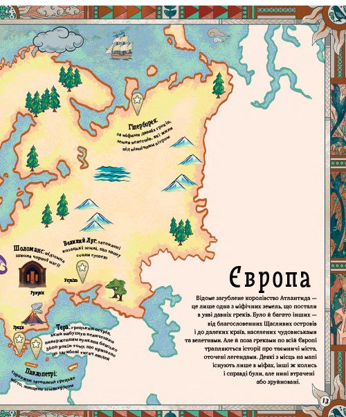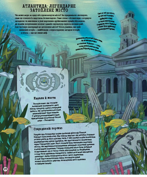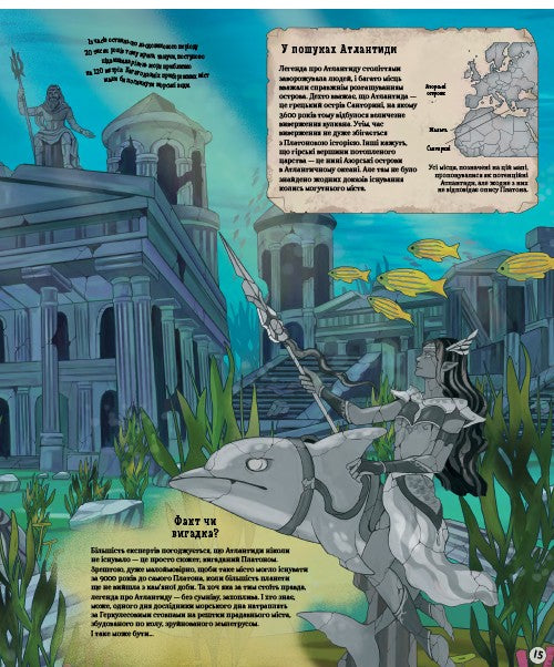 Завдяки цій книзі діти ознайомляться з багатою міфологією різних культур: від ацтеків до стародавніх британців, від грецьких легенд до японського фольклору за допомогою таємничих зображень, легенд про стародавні міста, палаци, острови й континенти.